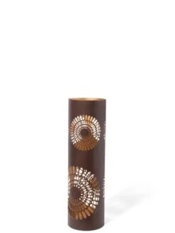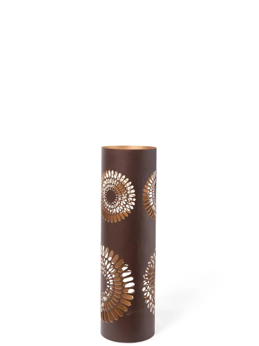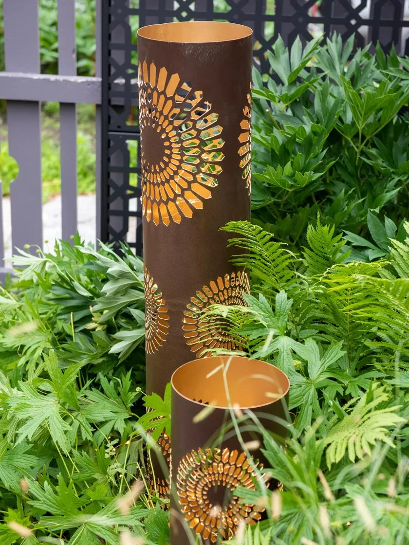 Add some ambiance to your after-dark garden with this trio of lanterns. The beautiful dahlia cutout design casts an intricate pattern on your table or patio. The muted copper-like exterior has a shiny, metallic interior that amplifies the shimmer. Available in three heights.